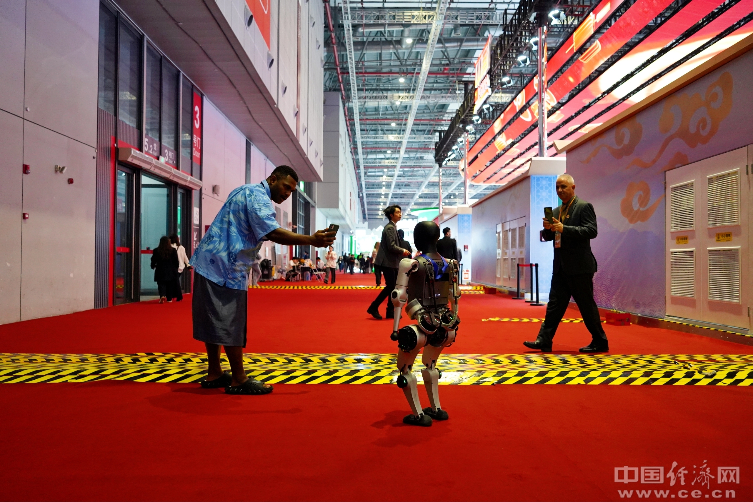 11月5日至10日,第八届中国国际进口博览会(简称“进博会”)在上海举行,各个展馆人头攒动。图为机器人“绕展走动”,吸引参观者驻足拍照。中国经济网记者 马昌彦 摄