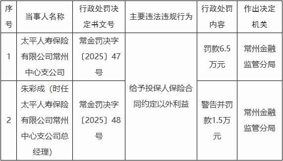 中国经济网络北京,9月22日,揭示长州监督部门的罚款信息的形式(Changjin罚款决定号[2025]号[2025]号,Taiping Life Insurance Co,Ltd。的Changzhou Central Central Consurance,Ltd。的总经理Zhu Caicheng在这里负责。